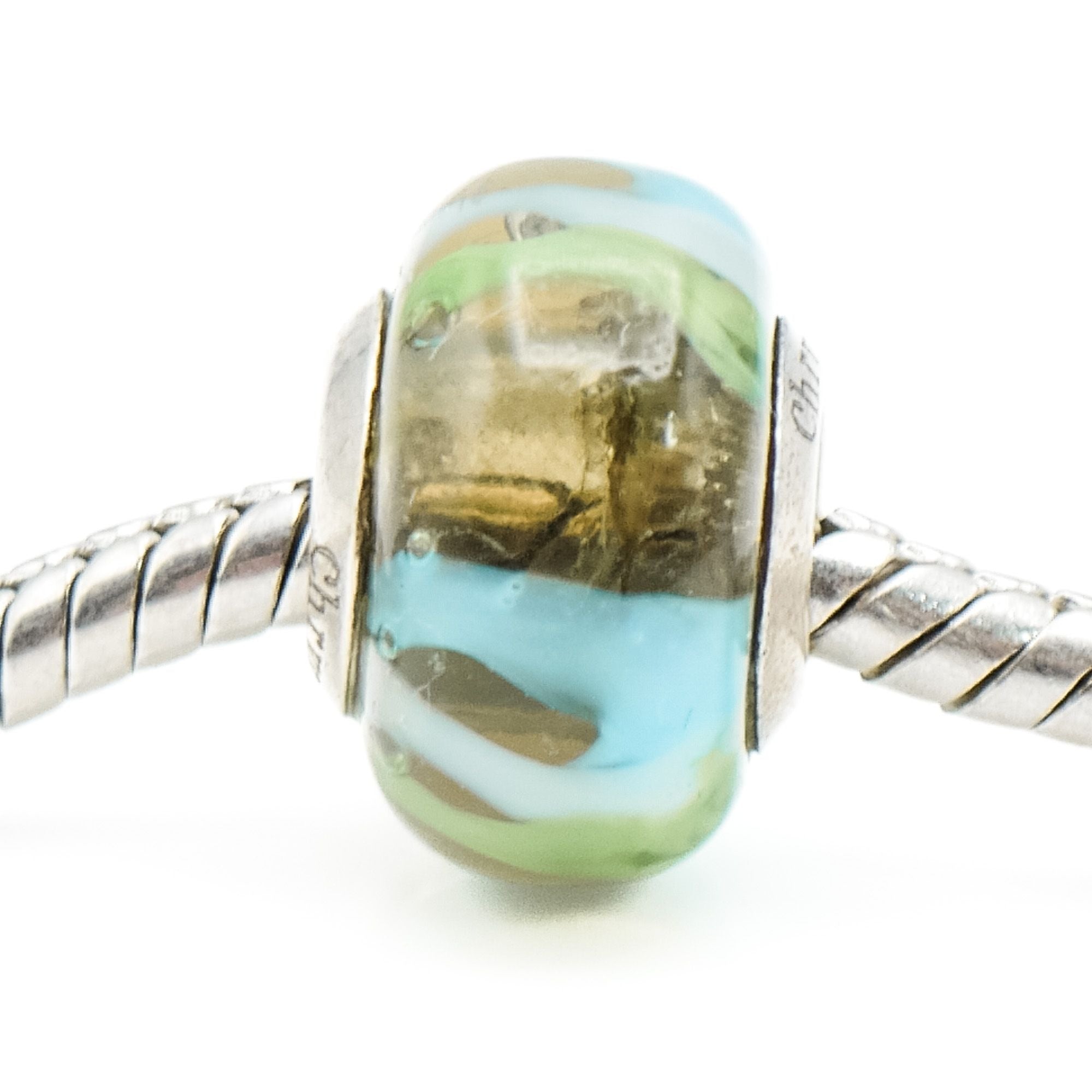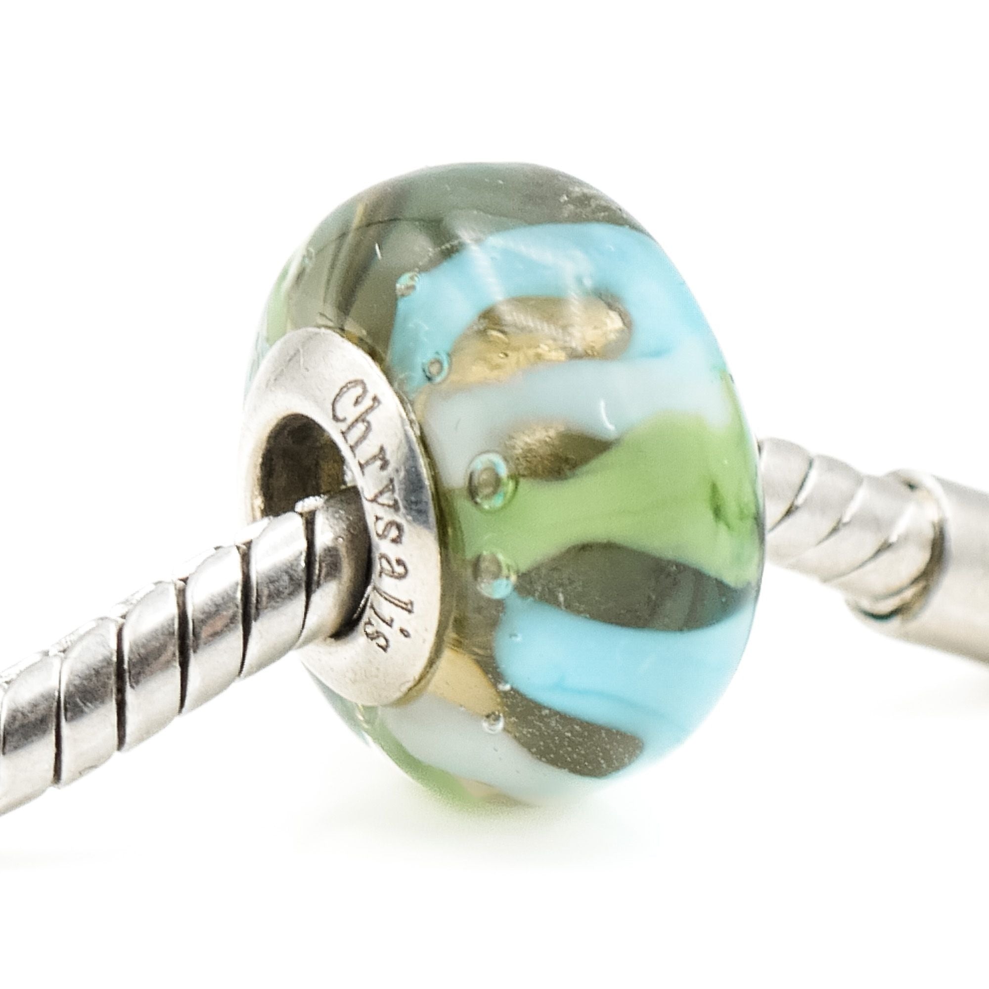 Delicate and dreamy, this Chrysalis charm features blue, green and white lines that look like paint running down, captured in translucent green Murano glass. Set on a sterling silver core, it’s the perfect addition to your charm bracelet to bring a soft, romantic touch.