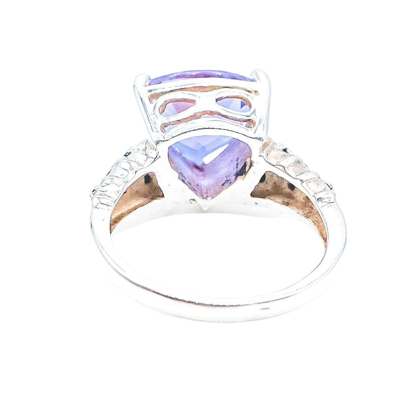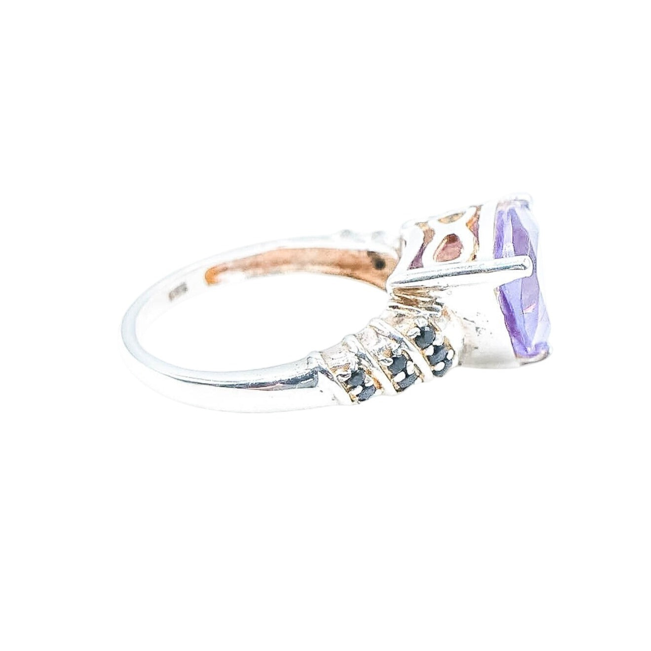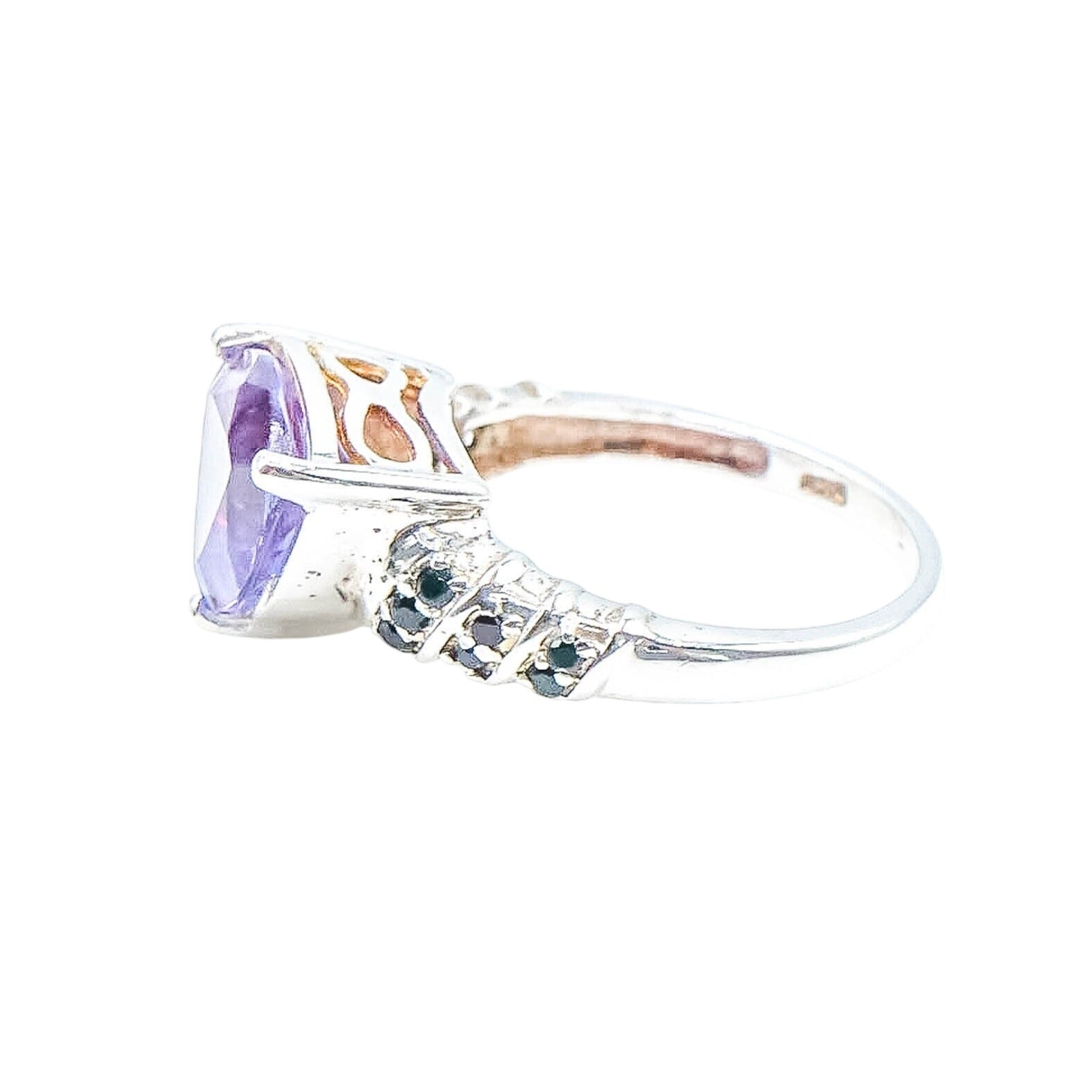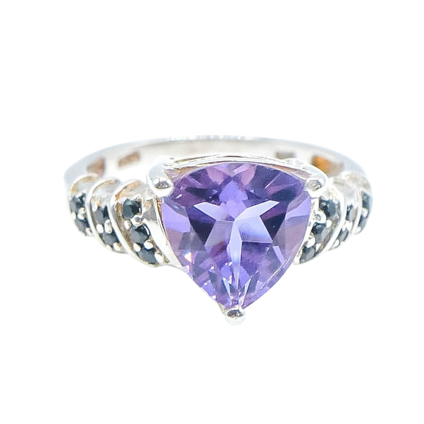 This sterling silver ring showcases a stunning triangular purple cubic zirconia as its centerpiece, accented by subtle black tourmaline stones along the elegant band. Its intricate detailing and precious design make it an exceptional addition to refined jewelry collections. The vibrant contrast of colors perfectly enhances its sophisticated charm and timeless allure.