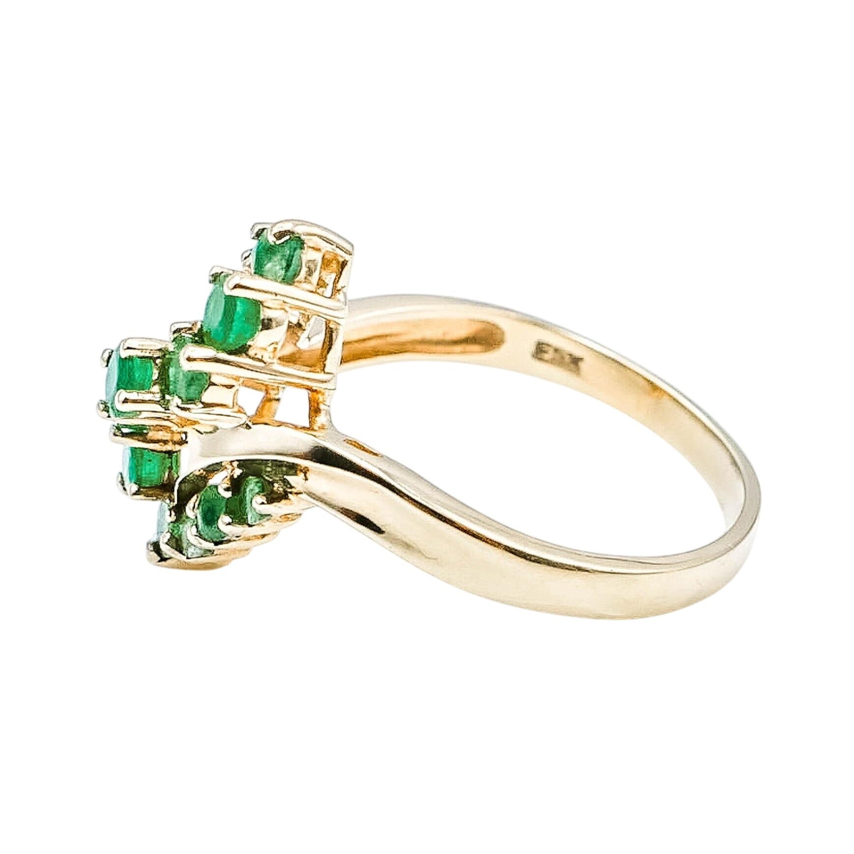 Vintage 10k Yellow Gold Natural Emerald Ring Size 7.5. This 10K Yellow Gold ring features 14 round cut Emeralds in various sizes. These Emeralds have a beautiful dark color and feature a cascading design. Emeralds symbolize love and truth. Green is the color of life. It is often associated with nature, health, growth and prosperity. It represents hope for the future. The Emerald is the birthstone for May.