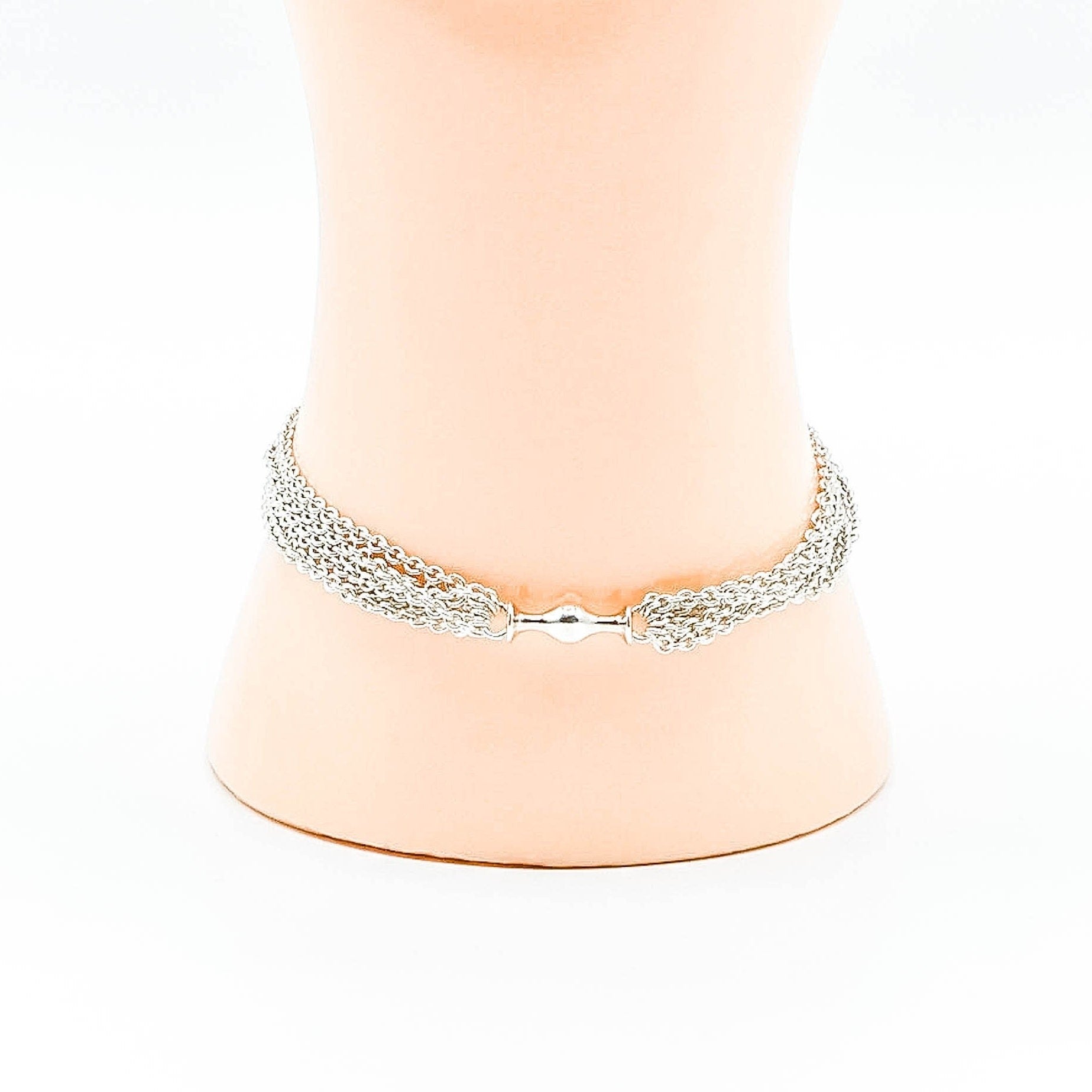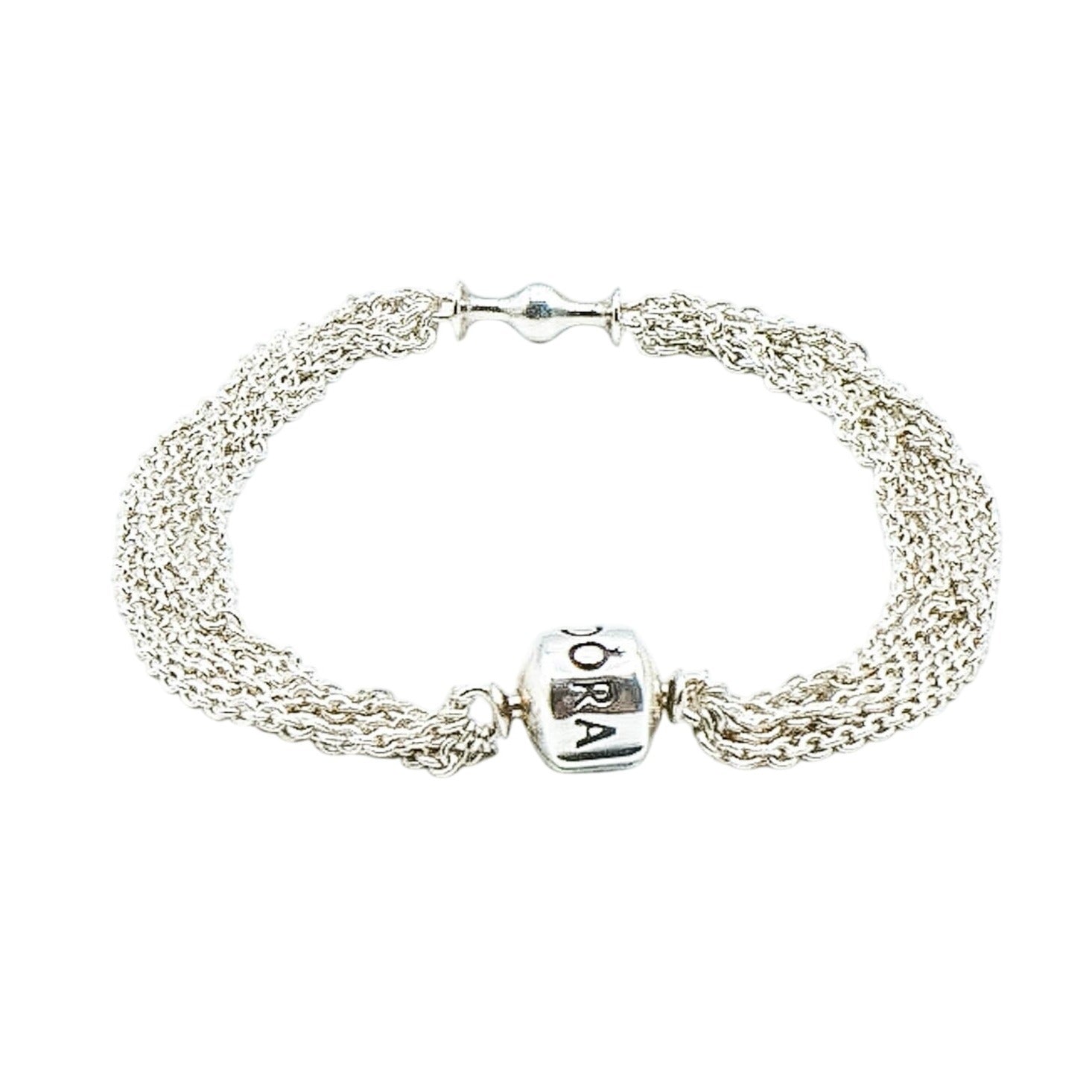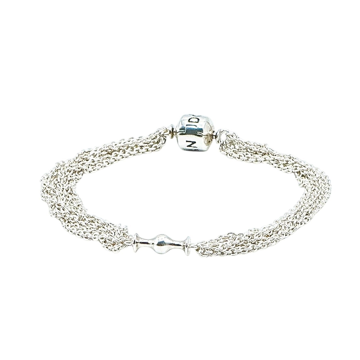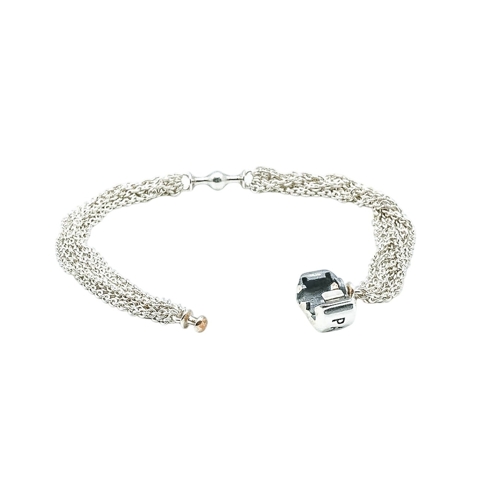 Authentic 9.1-Inch PANDORA Sterling Silver Multi-Strand One Station Clip Capture Bracelet With Pandora Clasp 591701 - Retired. This gorgeous Sterling Silver bracelet combines several Sterling Silver strands that connect in two locations, at the clasp and on the opposite side, where it gives room for a single Pandora clip. Show off your favorite clip with a bracelet that is designed for that purpose. Dangle clips look absolutely wonderful with this bracelet.
