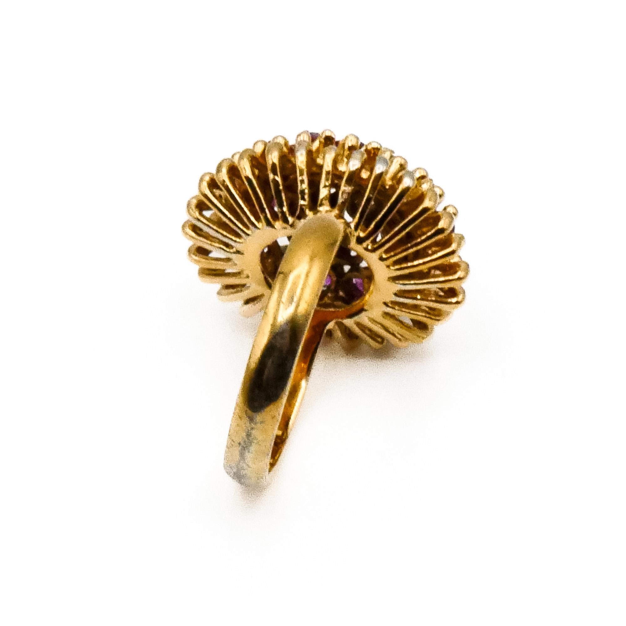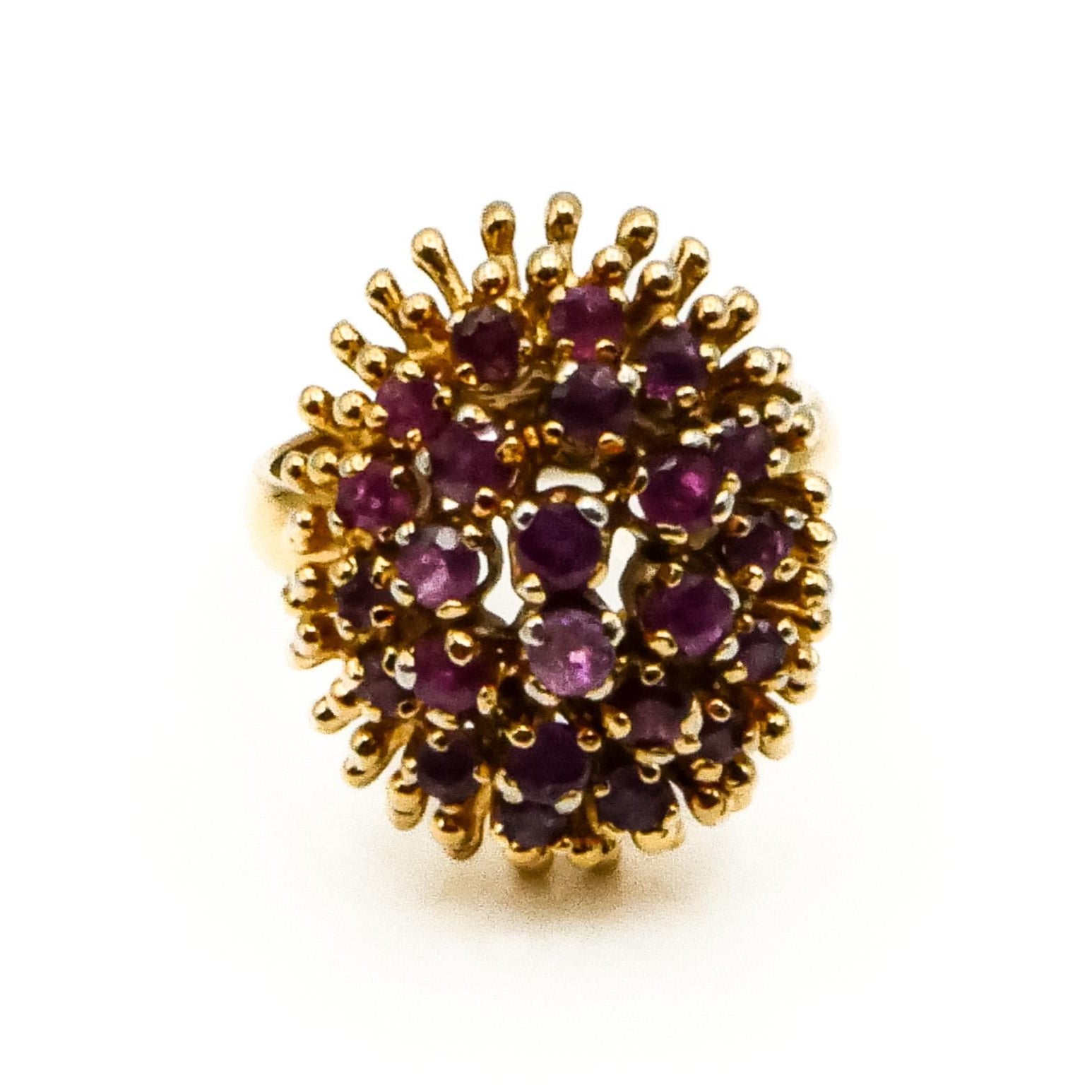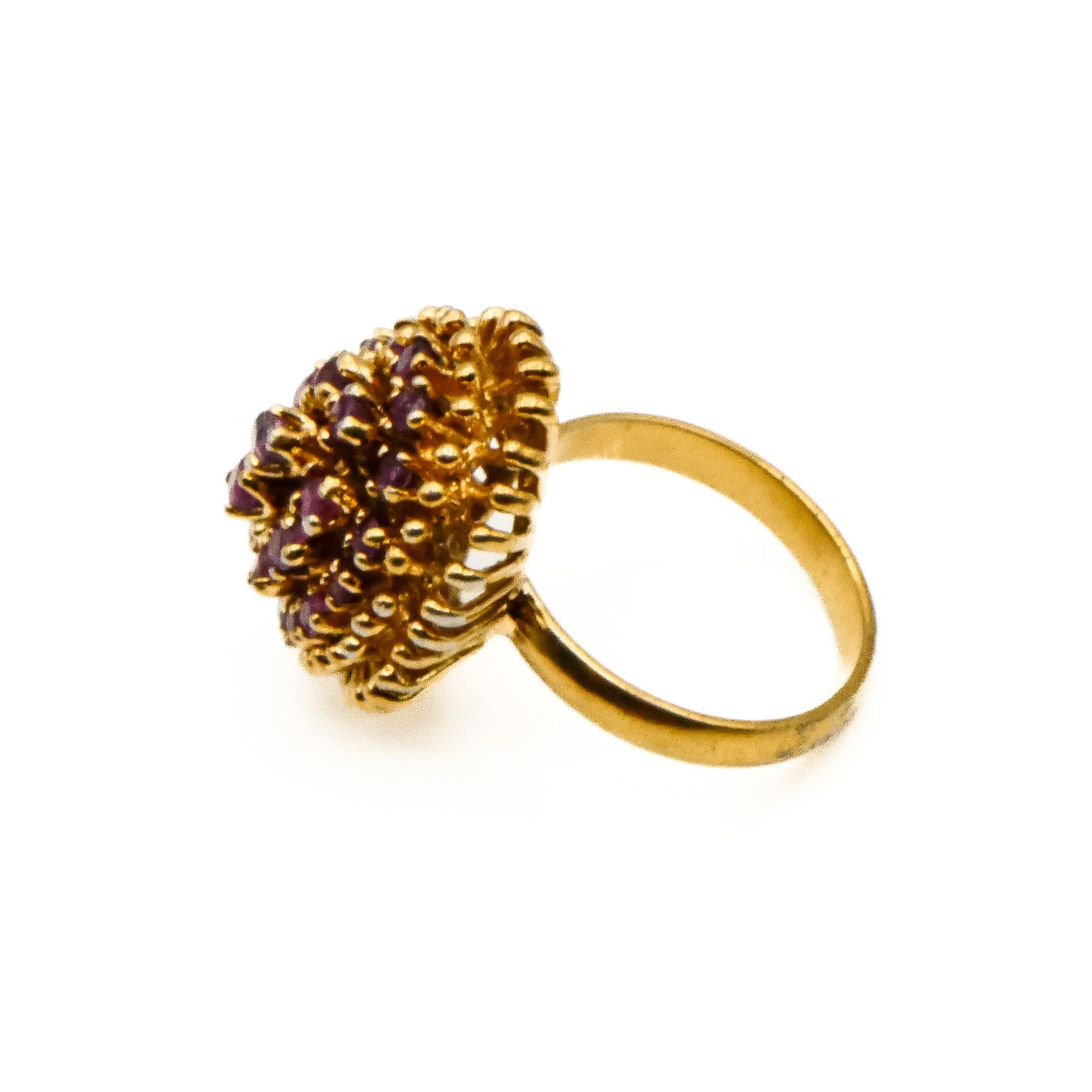 Radiating timeless elegance, this vintage cocktail ring features a vibrant cluster of natural rubies set in luxurious 14K yellow gold plating. The rich red hues of the rubies create a stunning floral-like display, perfect for adding bold sophistication to any ensemble.