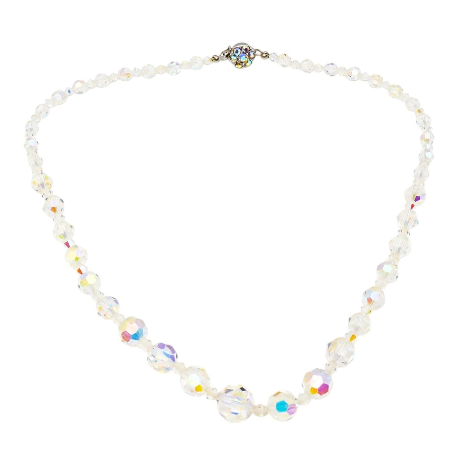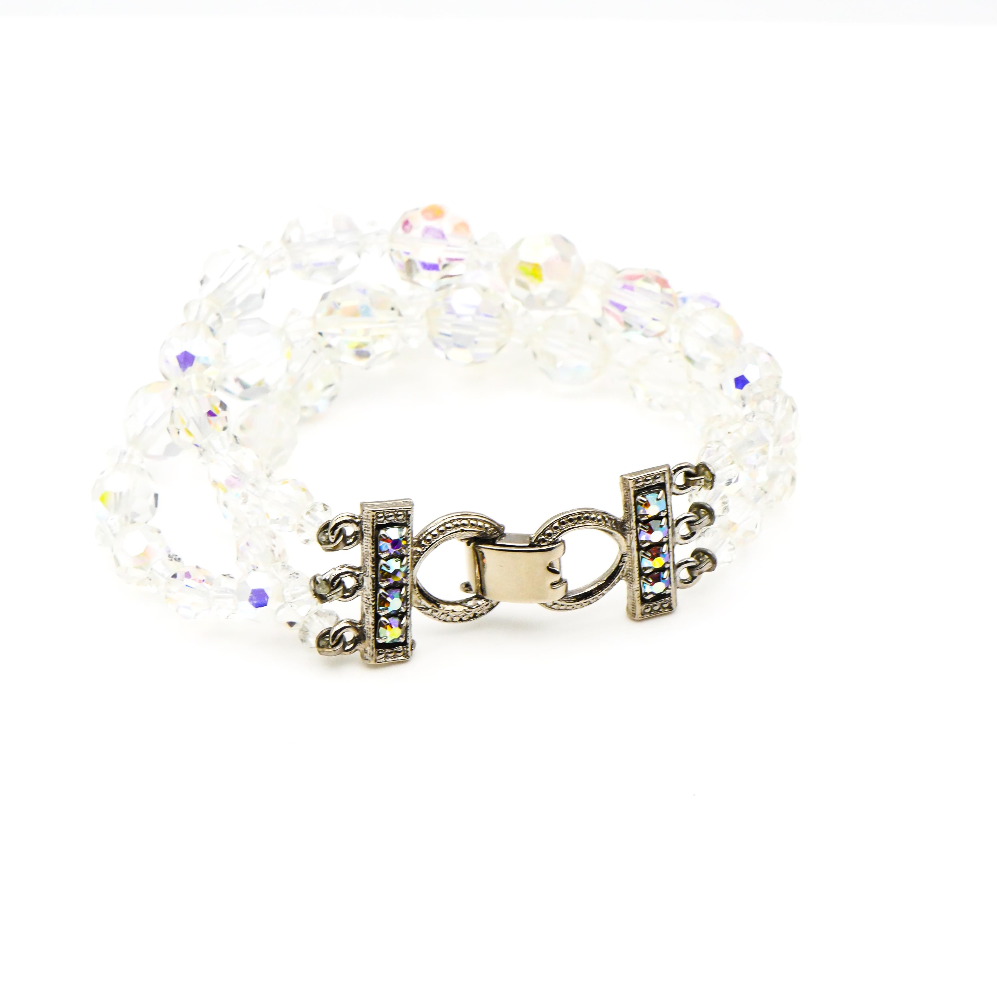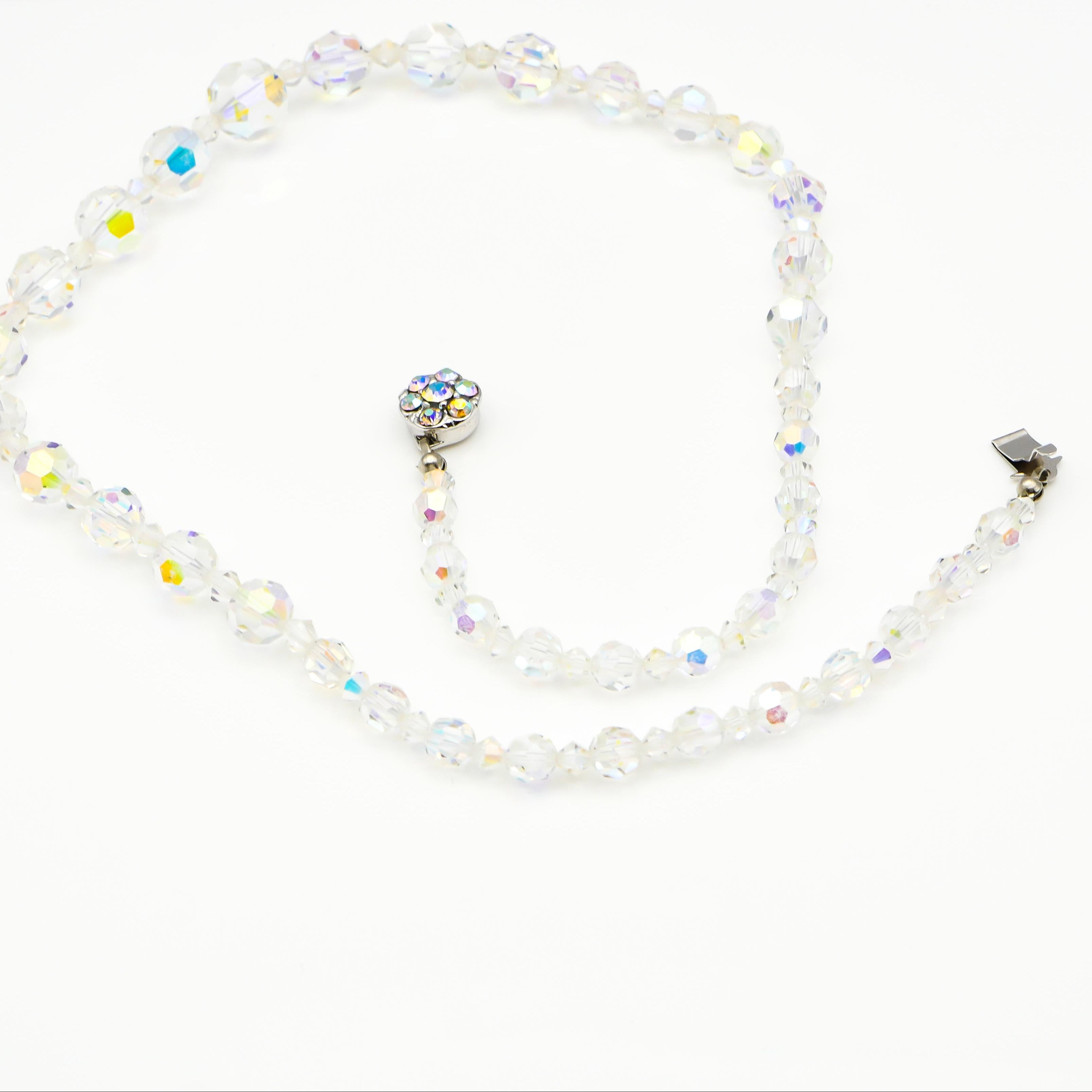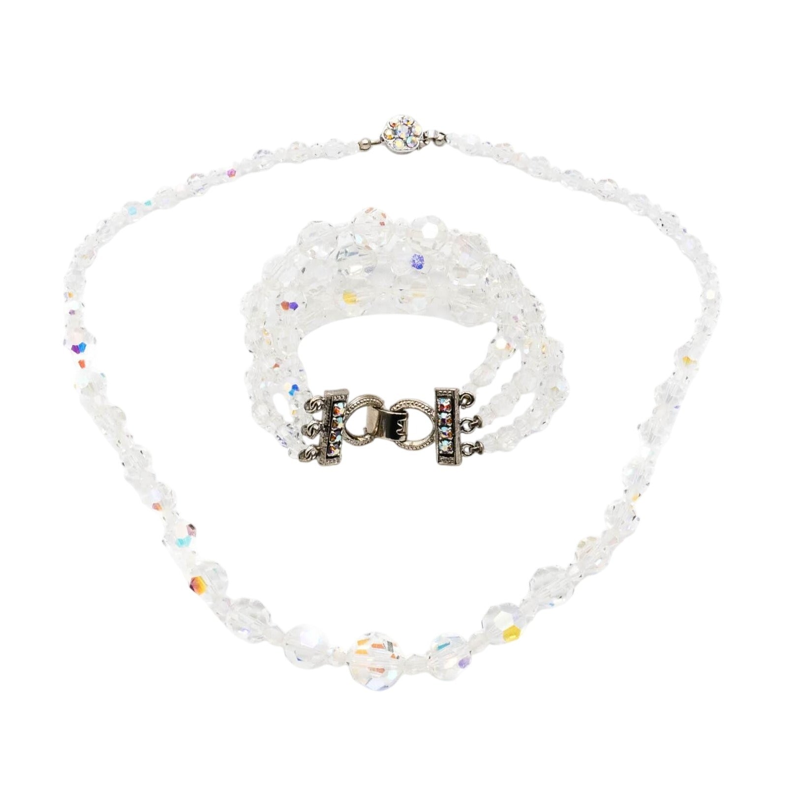 This dazzling vintage demi-parure set includes a graduated Aurora Borealis crystal bead necklace and a matching bracelet, both crafted with alternating faceted beads that shimmer with iridescent light. The beads range in size to create a dimensional, elegant silhouette, perfect for any vintage jewelry lover or collector of mid-century sparkle.