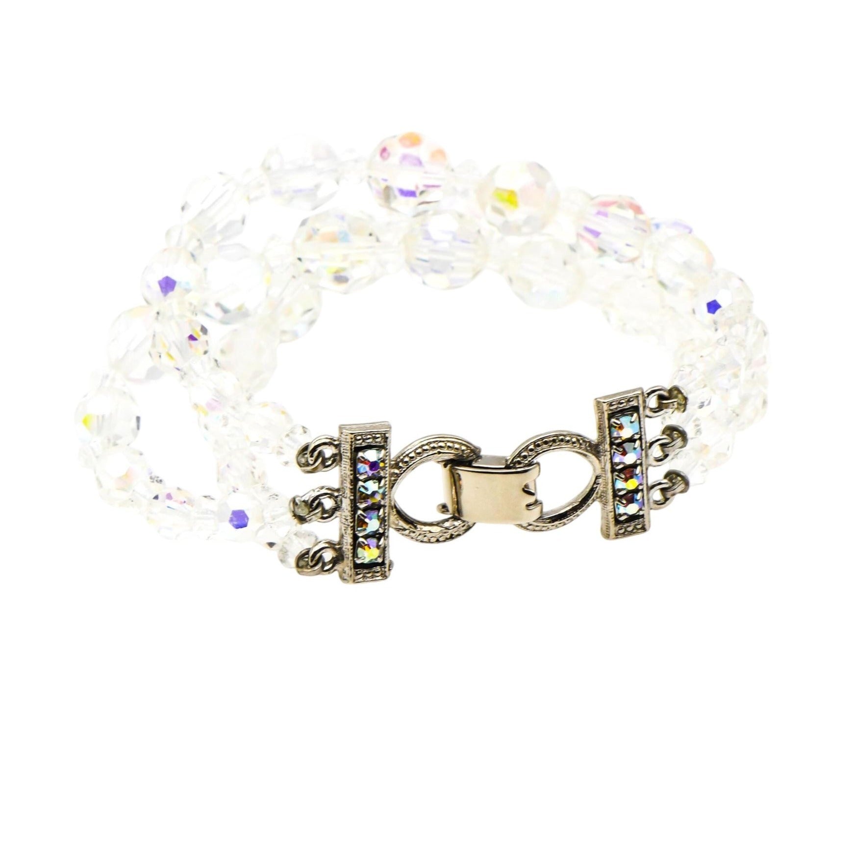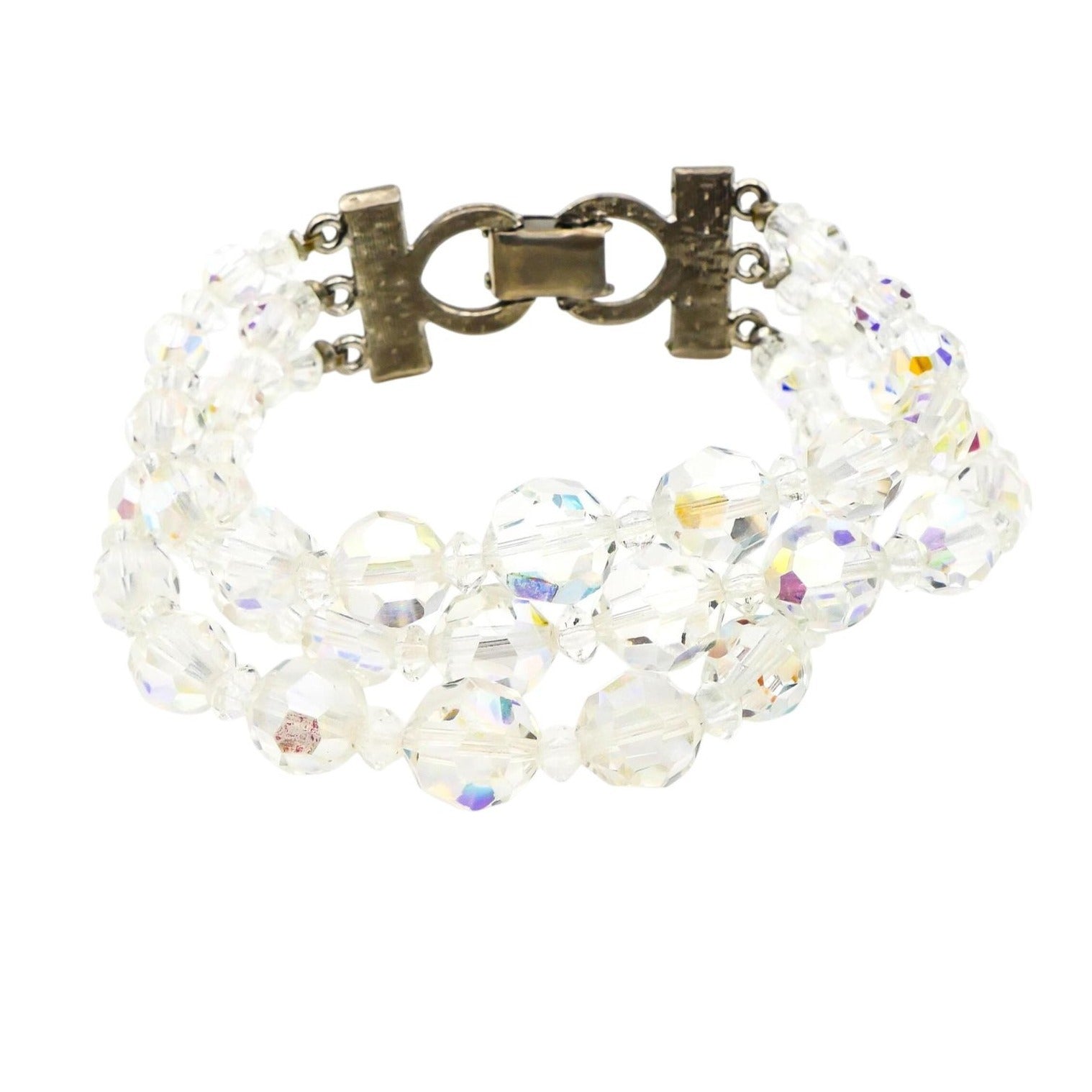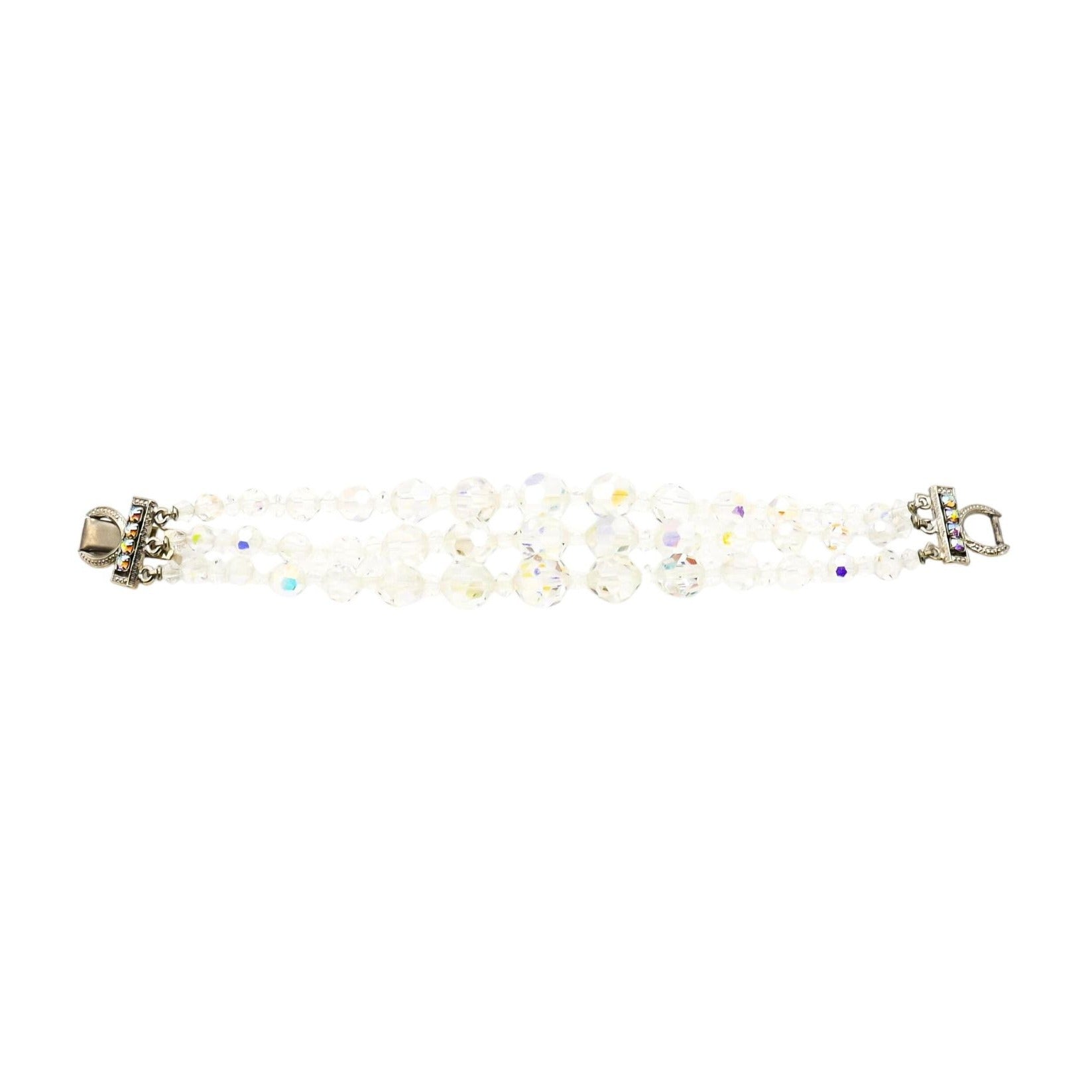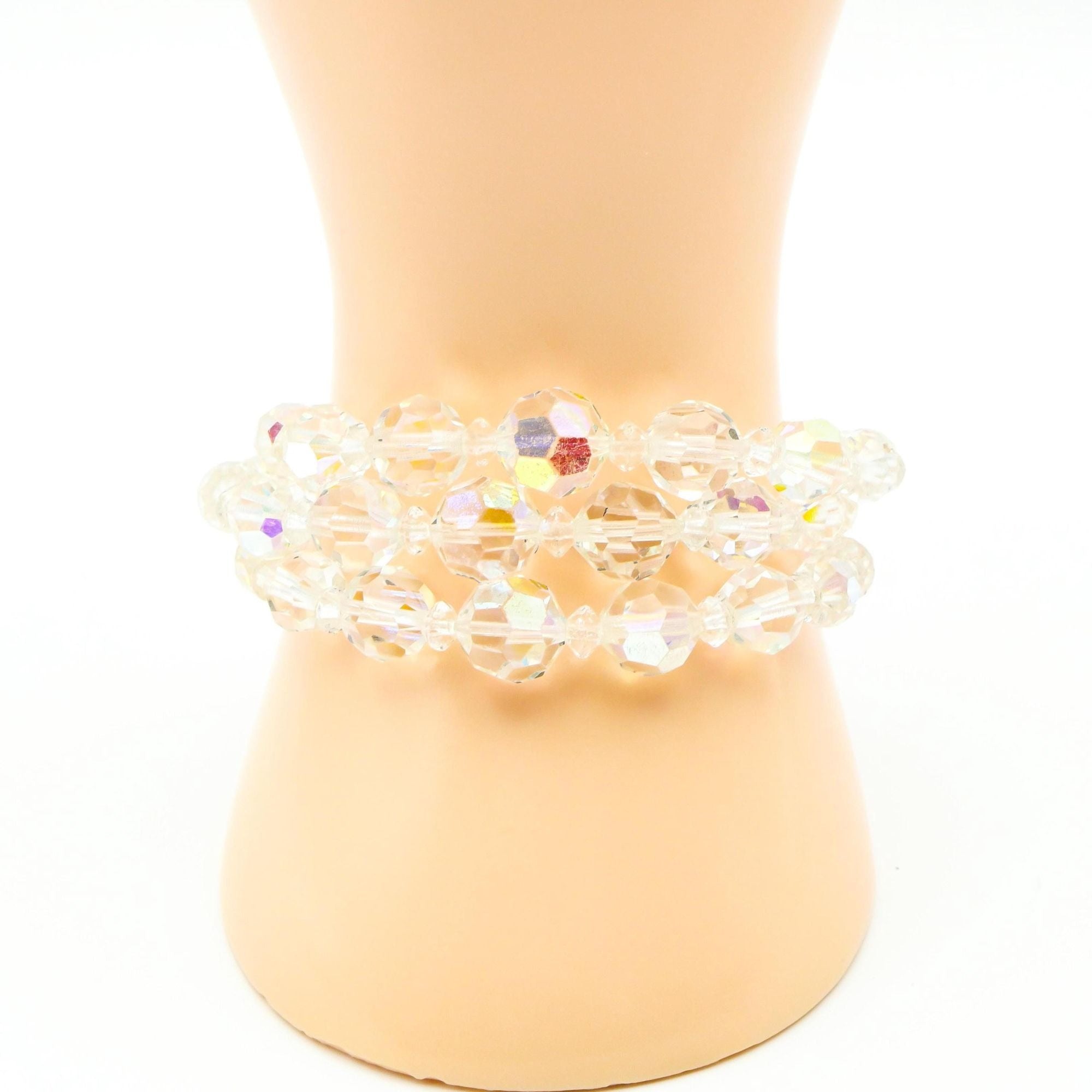 This dazzling vintage demi-parure set includes a graduated Aurora Borealis crystal bead necklace and a matching bracelet, both crafted with alternating faceted beads that shimmer with iridescent light. The beads range in size to create a dimensional, elegant silhouette, perfect for any vintage jewelry lover or collector of mid-century sparkle.
