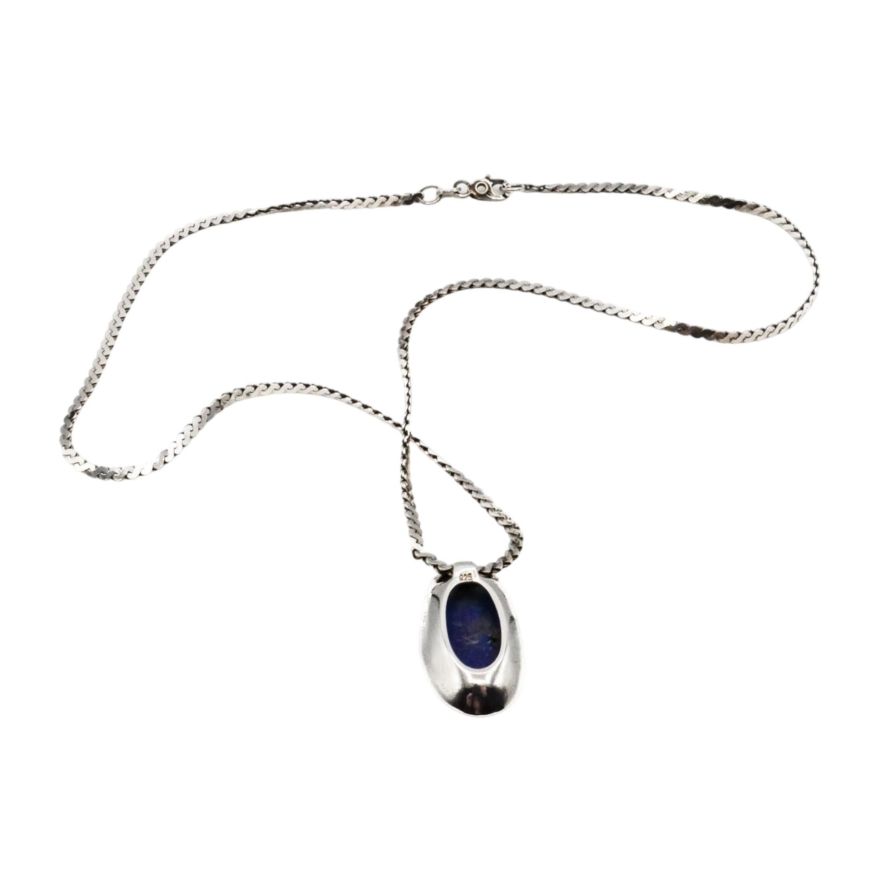 Timeless and deeply symbolic, this vintage necklace features a natural oval Lapis Lazuli cabochon in a beautifully crafted Sterling Silver bezel setting, suspended on a classic serpentine link chain. Known as the stone of wisdom and protection, Lapis Lazuli has been worn in jewelry for over 6,500 years.