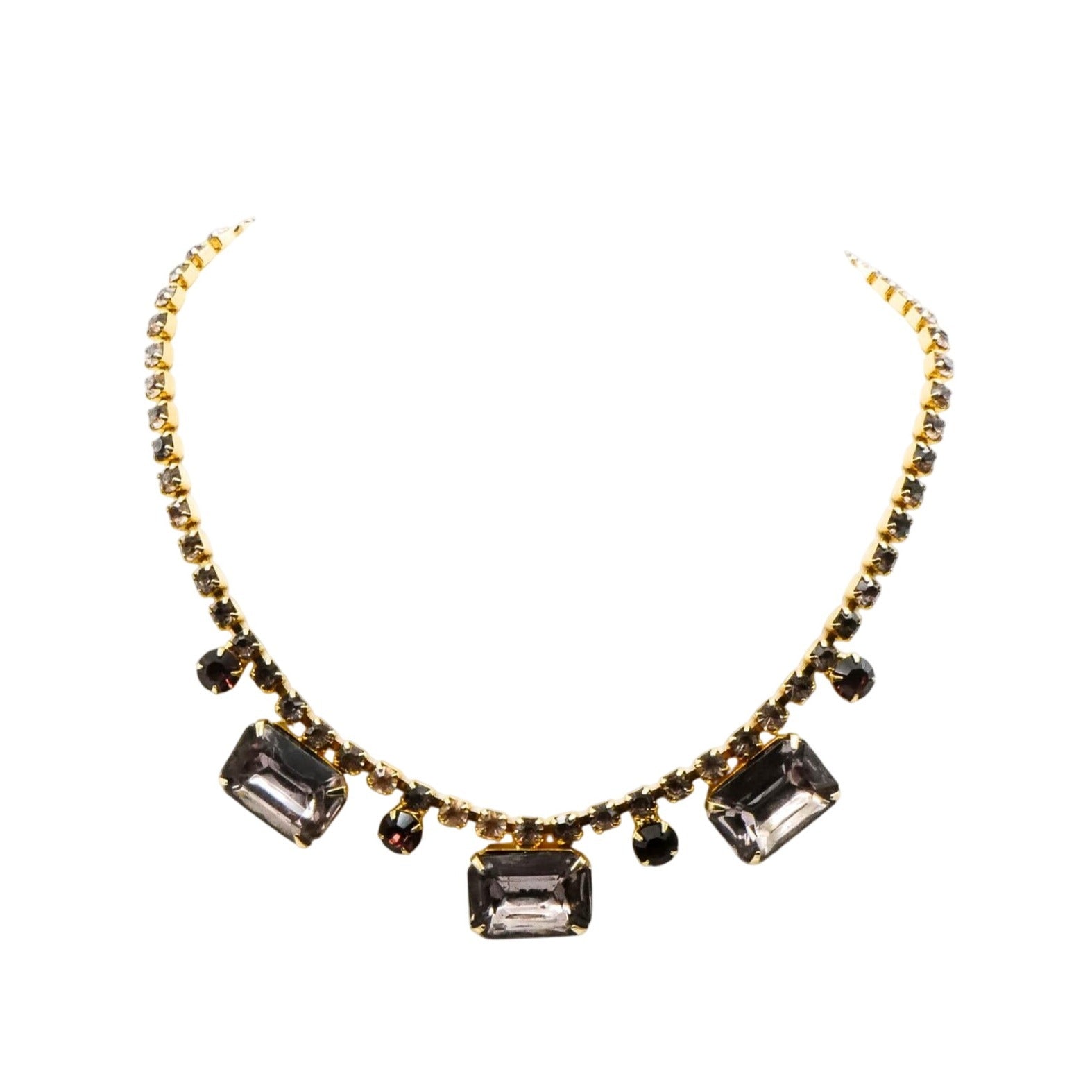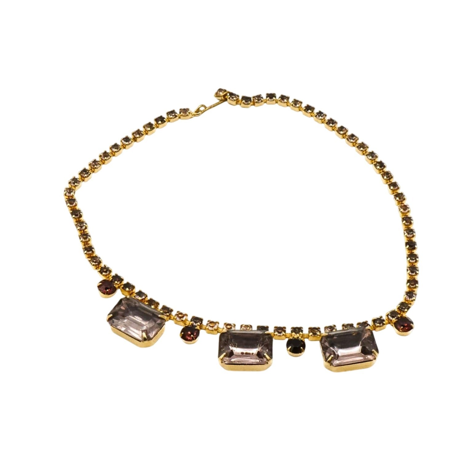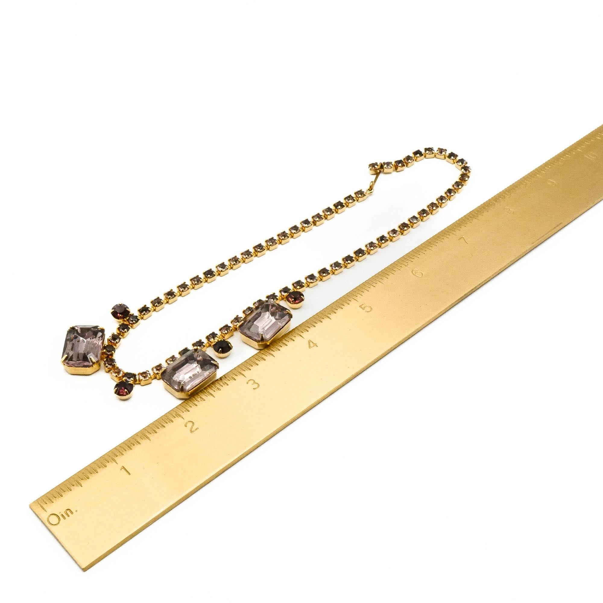 A stunning 15-inch vintage necklace featuring alternating round and square amethyst-colored rhinestones in deep purple and soft lavender tones. A bold and elegant piece perfect for special occasions or vintage lovers.