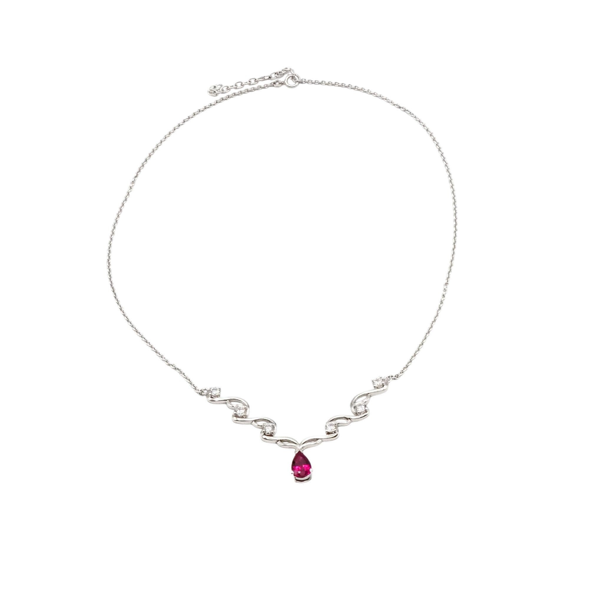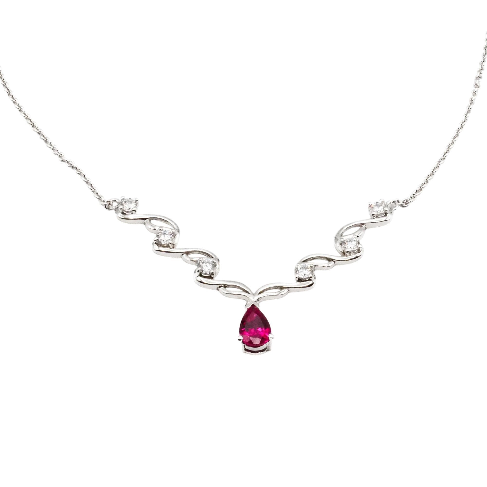 Celebrate love with this stunning Sterling Silver necklace, showcasing a vibrant pear-cut lab-created Ruby framed by clear CZ stones in an elegant infinity pattern. Romantic and timeless, it’s the perfect gift for Valentine’s Day, anniversaries, or a July birthday.